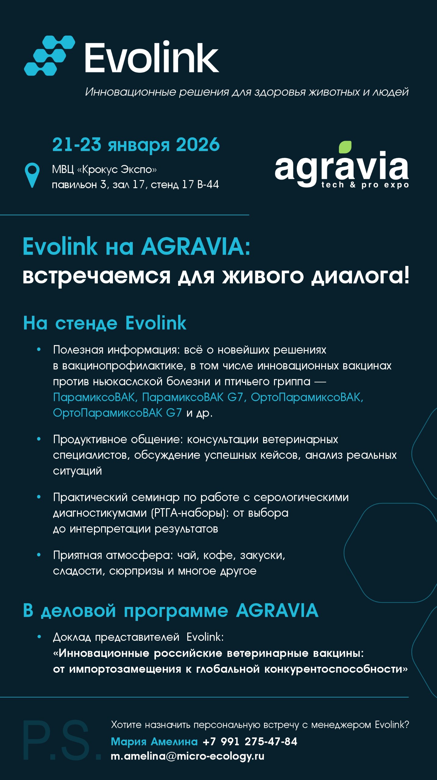 В деловой программе AGRAVIA - доклад представителей Evolink. Тема: «Инновационные российские ветеринарные вакцины: от импортозамещения к глобальной конкурентоспособности».